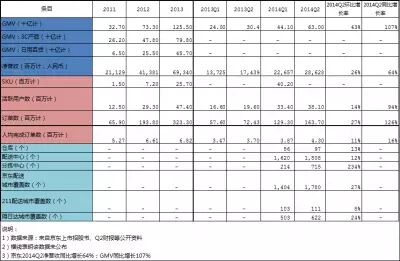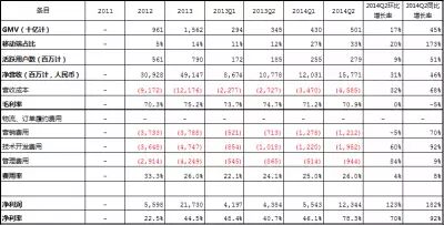2014年Q2,京东的财务表现应该说是符合市场预期的。京东Q2 GMV达到630亿,同比增长107%;净营收286亿元,同比增长64%;活跃用户数达到3810万,同比增长94%;订单数也有126%的同比增长。可以看出,京东上半年依旧在进行品类扩充,活跃用户数的增加也带动了交易额、净营收的增长。另一方面,在物流建设方面,仓库个数环比增长13%,达到97个;配送中心环比增长12%,达到1808个;京东配送的城市覆盖数达到1780个,环比增长27%,而对应的订单履约费用环比增长47%。这些数据表明,京东Q2继续实施大规模物流体系建设,在品类扩充的同时,不断进行物流体系升级,用优质的物流服务吸引更多的用户下单。同时,由于Q2与腾讯的战略融合,产生了无形资产的摊销以及其他相关费用,产生5.8亿净亏损。