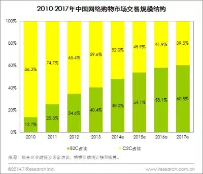 其实,作为一个对京东模式比较熟悉的人,十节甘蔗的说法比较贴切的抽象出了京东模式的实质,即把控整个零售环节,无缝为用户提供服务。十节甘蔗描述的是正是消费品零售行业的供应链模型,对应的是电商中的B2C模式。根据艾瑞咨询的数据,2013年B2C在网络购物市场中占比达到40.4%,B2C市场增长迅速,预计2014年在网络购物市场中占比将近半。也就是说,随着消费者购物意识、对品质、服务的重视,B2C将会是未来几年线上越来越重要的购物模式,也会是今后京东和阿里正面交锋的主战场。