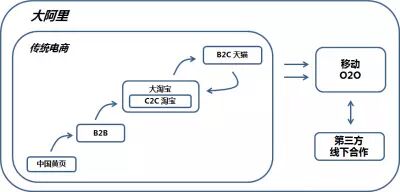大家如果熟悉阿里的发展历史,就会发现阿里的战略实质是大平台战略。它先搭建一个平台,然后做大平台;到某个拐点时,会将平台升级,然后再做大。阿里最早的雏形是一个商品交易的网站,即阿里B2B平台。当平台稳定后,马云在03年创立了C2C淘宝平台,并成功实现本地化,赶走了当时不可一世的eBay。之后的5年,是淘宝平台的做大期。依附于大淘宝衍生出来支付宝、广告系统、微小企业贷款等相关业务,使阿里稳定盈利,并坐稳电商第一把交椅。直到08年,阿里建立了淘宝商城(后改名叫做天猫),做B2C业务。阿里随后打通了B2B、大淘宝、天猫、云服务等平台,并开始着手建设菜鸟网络,实施“大阿里”战略。至此,可以看做阿里在传统PC电商的布局基本完成。2013-14年,阿里又逐步开始了移动电商、O2O的布局(手机淘宝、投资微博、收购高德,与银泰联姻等)。
